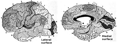 Muchas de las áreas cerebrales de Brodmann definidas tienen sus propias estructuras internas complejas. En varios casos, las áreas del cerebro están organizadas en "mapas topográficos", donde secciones contiguas de la corteza corresponden a zonas contiguas en el organismo o de alguna entidad abstracta más. Un ejemplo sencillo de este tipo de correspondencia es la corteza motora primaria, una franja de tejido que se extiende a lo largo del borde anterior del surco central. Las áreas motoras que inervan cada parte del cuerpo se derivan de una zona distinta, con partes del cuerpo adyacentes representadas por zonas adyacentes. La estimulación eléctrica de la corteza en cualquier punto provoca una contracción muscular en la parte del cuerpo representada. Sin embargo, esta representación "somatotópica" no se distribuye proporcionalmente. La cabeza, por ejemplo, está representada por una región alrededor de tres veces más grande que la zona para toda la espalda y el tronco. El tamaño de una zona se corresponde con la posible precisión del control motor y la discriminación sensorial [cita requerida]. Las áreas para los labios, los dedos y la lengua son particularmente grandes, teniendo en cuenta el tamaño proporcional de las partes del cuerpo que representan.
